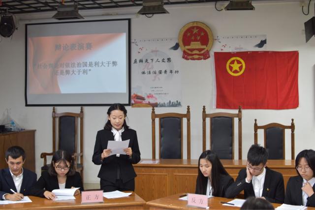 活动中,在场嘉宾和团学骨干共同观看了视频——《同守依法心 共谈治国路》,使大家对“全面推进依法治国”有了全面深刻的了解。以“社会舆论对依法治国是利大于弊还是弊大于利”为辩题的辩论表演赛,可谓精彩绝伦,不仅拓宽了同学们的思维,也号召人文学子,用青年法学人、最美传播者的角度,身体力行践行“依法治国”理念。