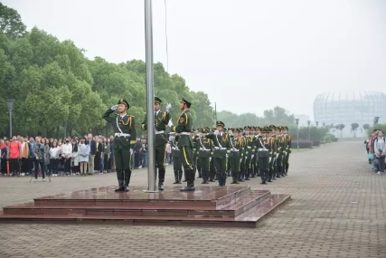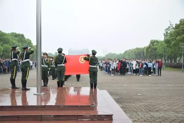 早上6:45,全体成员集合完毕。微凉的天气和丝丝细雨丝毫没有影响到老师和同学们的热情,大家排好队形,等待着庄严的升旗仪式的开始。