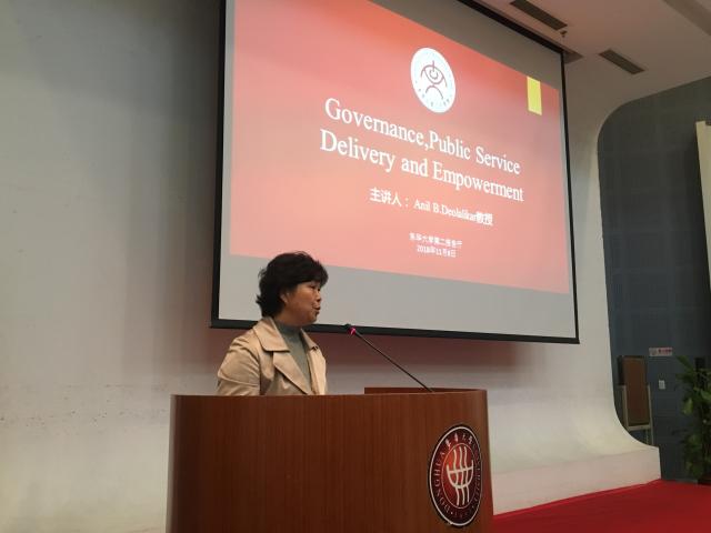 2018年11月8日下午,美国加州大学河滨分校公共政策学院院长Anil B. Deolalikar访问滚球买球的app官网,并在图文信息第二报告厅,为滚球买球的app官网师生作了题为《亚洲发展中国家的授权与公共服务提供》的学术报告,滚球买球的app官网党委书记王英出席本次活动并致欢迎辞,滚球买球的app官网王锐兰教授,副教授刘奕、尹艳华、邓志锋一同出席本次活动。