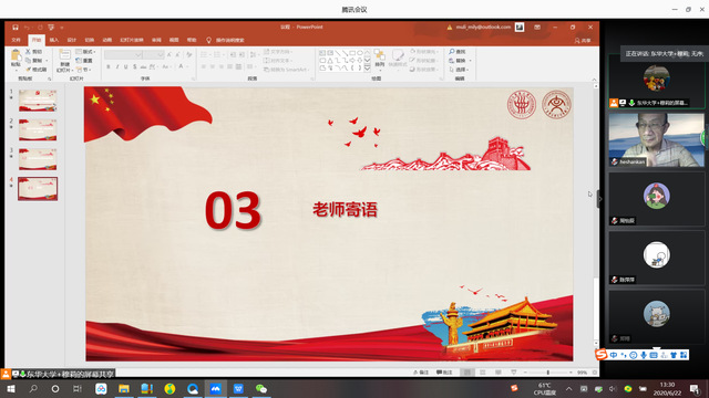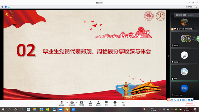 为强化2020届本科毕业生党员思想引领,增强毕业生党员守初心、担使命的理想信念,6月22日,滚球买球的app官网召开主题为“永葆初心·践行使命·筑梦起航”的毕业生党员离校线上座谈会,旨在帮助毕业生党员筑牢信仰之基、把稳思想之舵,让初心薪火相传,把使命永担在肩。滚球买球的app官网关工委分会常务副主任贺善侃,滚球买球的app官网党委副书记罗薇娜,副院长、党委委员吴志刚,“薪传聚力”党支部书记、专职辅导员李华清,“法政先锋”党支部书记、专职辅导员木拉提,以及25位本科毕业班党员同志出席此次活动。座谈会由“尚实先锋”党支部书记、党建专职辅导员穆莉主持。