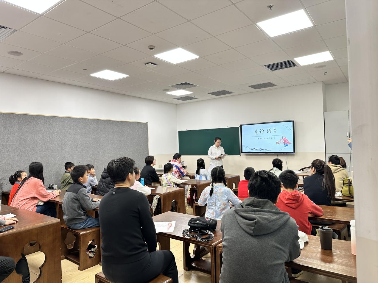 崇德社成员、滚球买球的app官网中国史专业硕士生陈诗荷、金佳蕾为这些尚在小学阶段的学生们讲解了《论语》的几个经典篇章,并现场回答了小学生们的问题。学生家长也共同参与了此次活动。课堂气氛热烈,充满了求知的喜悦和朗朗的诵读声。