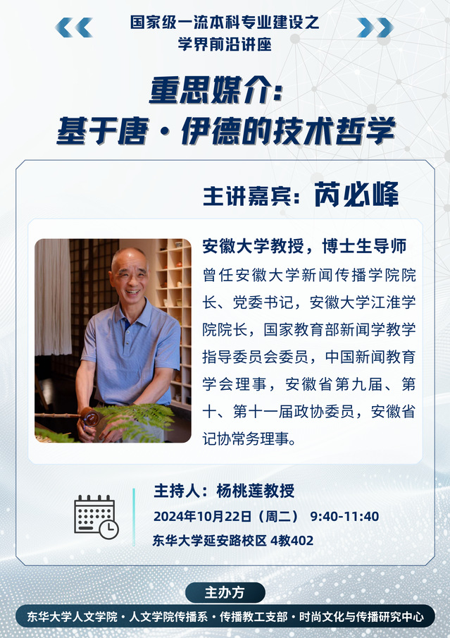 唐.伊德是享誉世界的技术哲学家。本讲座在介绍和阐释唐.伊德技术哲学思想的基础上,对技术媒介进行重新思考,认为媒介是在传播关系中生成的现象,而不是外在于人的既成对象;媒介不仅是人的延伸,更是人的“延异”;媒介既反映对象又抵抗对象,它和被显现物之间存在一种不可弥合的间隙;人与技术媒介之间存在着多元、复杂的关系。