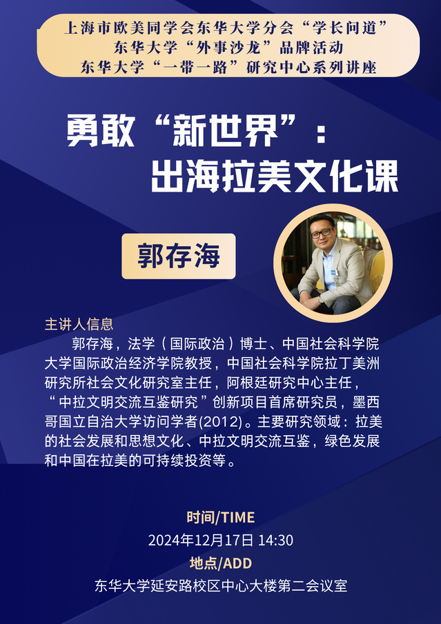 郭存海,法学(国际政治)博士、中国社会科学院大学国际政治经济学院教授,中国社会科学院拉丁美洲研究所社会文化研究室主任,阿根廷研究中心主任,“中拉文明交流互鉴研究”创新项目首席研究员,墨西哥国立自治大学访问学者(2012)。主要研究领域:拉美的社会发展和思想文化、中拉文明交流互鉴,绿色发展和中国在拉美的可持续投资等。